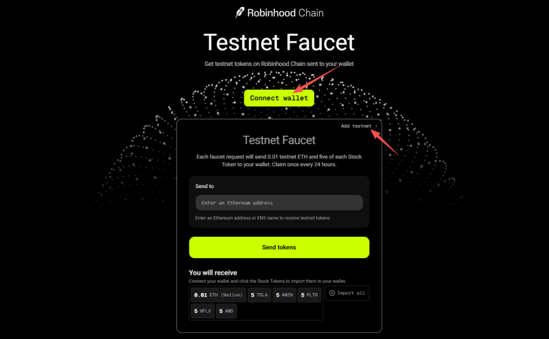 STEP 1. 添加測試網路並領取測試幣(連結:https://faucet.testnet.chain.robinhood.com/)。