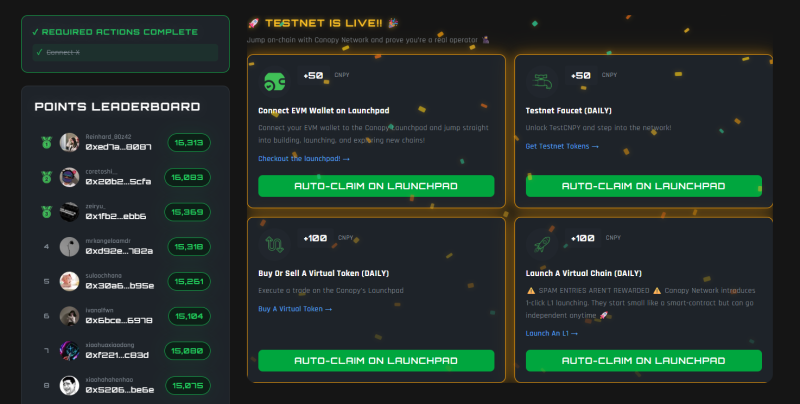 Canopy 是由 AI 驅動的 L1 公鏈,項目目前處於測試網階段,並已上線積分激勵活動。2025 年 1 月末,Canopy 宣布完成 120 萬美元種子輪融資,由 Mechanism Capital 和 CitizenX 領投,Primitive、GSR 以及 Side Door Ventures 參投。