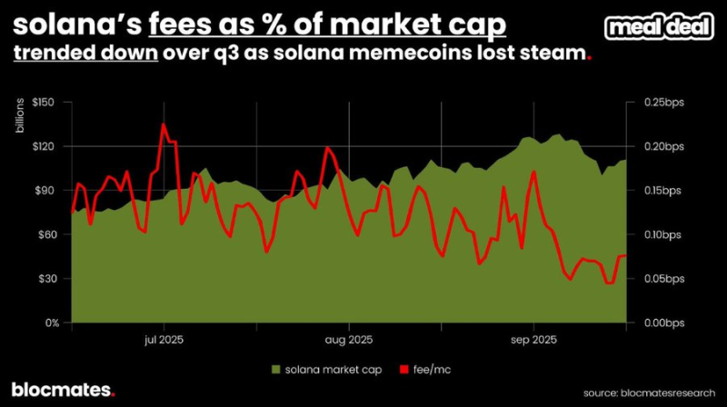 從數據來看,隨著交易者從Meme 投機轉向永續合約,Solana 的鏈上收益指標出現明顯影響:鏈上費用佔SOL 市值的比例自7 月高點以來已下滑超過60%。