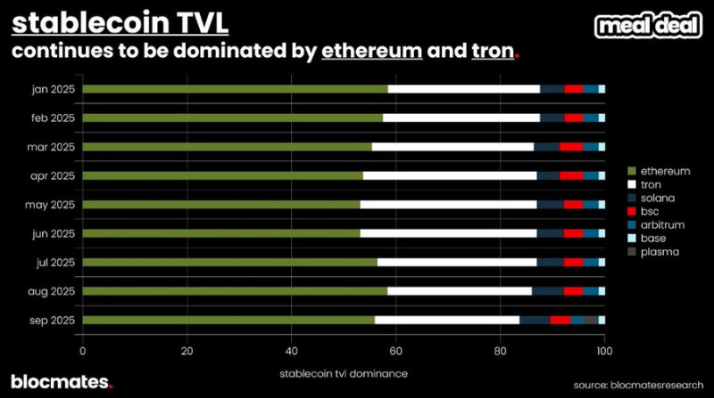 進一步拆解穩定幣TVL 佔比就會發現,以太坊與Tron 在過去幾季幾乎穩居主導,而一些新出現的應用鏈——例如@Plasma ——開始逐漸擠入這個格局。