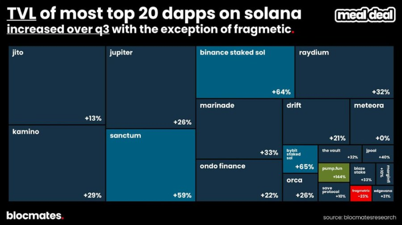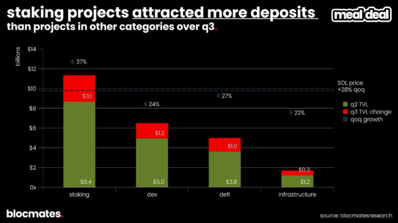 從TVL 成長速度來看,質押類產品是三季Solana 應用中的絕對亮點,幣安和Bybit 提供的質押SOL 以及@Sanctumso的產品在三季均錄得超過50%的成長。