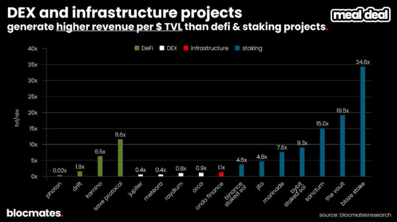 質押產品的短板在於獲利能力較弱:平均而言,一個質押協議需要21.7 倍的TVL 才能達到本次樣本中DEX 的平均收入水準。這再次說明了一個事實──在加密世界裡,投機者貢獻的利潤遠高於儲蓄者。