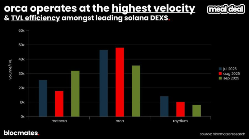 在DEX 賽道中, @Orca_so一直保持著TVL 效率(即「交易速度」)的領先地位。在給定的流動性規模下,Orca 上每一美元的交易頻率最高。