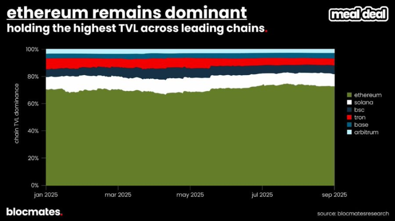 同時,儘管穩定幣在國會山莊與華爾街討論不斷,但主導者仍是以太坊與Tron,Solana 與Base、BSC、Arbitrum 等鏈處於「第二梯隊」。
