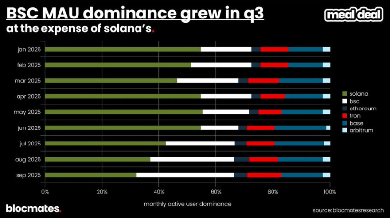就用戶規模而言,Binance Smart Chain 在三季憑藉與CZ 關聯的永續DEX——Aster——奪走了最多的注意力。大量使用者要麼在初夏選擇離場,要麼從Base 與Solana 遷移至BSC。