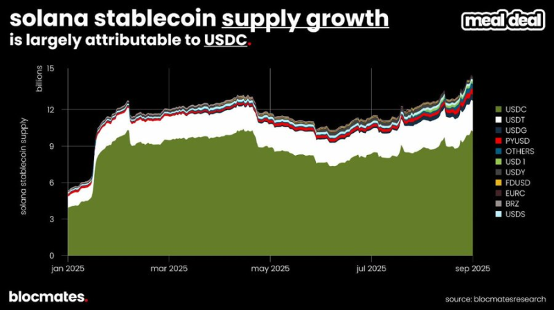 不過值得注意的是,由於對穩定幣的關注激增,Solana 的穩定幣供應自年初至第三季末幾乎增加了三倍。事實證明,「快且便宜」是吸引用戶使用穩定幣的一大賣點,尤其在Solana 的DeFi 生態已相當成熟的背景下。