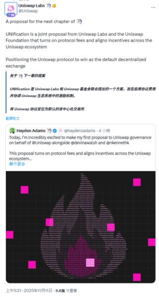 Uniswap 創辦人Hayden Adams 表示:「過去幾年,我們經歷了嚴苛的監管週期並付出巨大代價,如今環境開始改善。UNIfication 標誌著Uniswap 進入新的階段,將代幣、協議與社區重新對齊。」