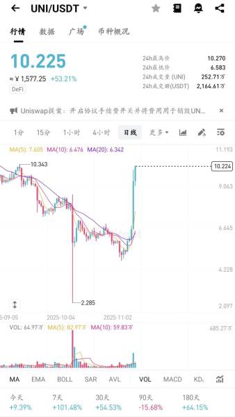 11 月11 日,去中心化交易所Uniswap Labs 與Uniswap Foundation 共同發布治理提案“UNIfication Proposal”,計劃啟用協議費用機制、實施代幣燃燒,並整合核心團隊治理結構。消息公佈後,UNI 代幣大幅上漲超50%,突破10 美元,市值突破60 億美元。