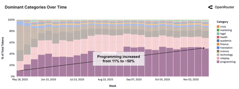 从 2025 年 5 月到 2025 年 12 月,与编程相关的所有 LLM 查询占比从 11% 增长到 50%。