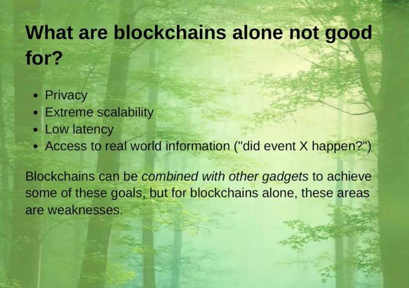 區塊鏈可以與其他的「小工具」(gadgets)結合來實現這些目標,但對於區塊鏈本身而言,這些領域是弱點。