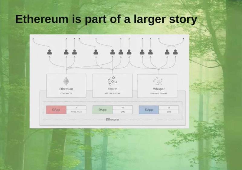 以太坊是更大故事的一部分。這張圖來自Gavin Wood 在2015 年的構想,也就是Web3 的早期願景:以太坊是一套科技中的一員,它們共同創造一個更自由、更開放的網路。